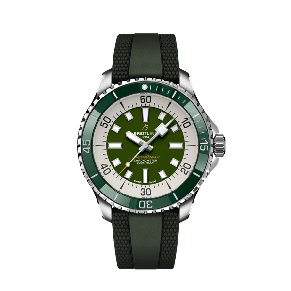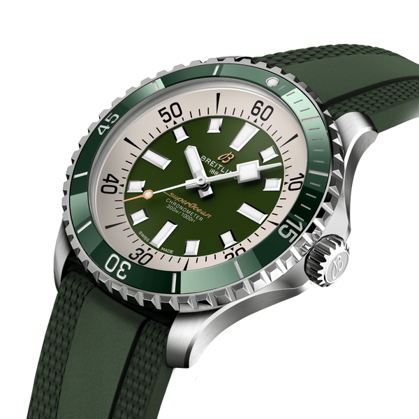 Leistung und Stil für alle Ihre Wassersport-Aktivitäten. In den 1960er-Jahren kam der neuartige Tauchsport gross in Mode. Für Taucher war Timing alles, und Breitling machte sich daran, eine möglichst schnörkellose Taucheruhr für sie zu entwickeln, bei der auf jede Funktion verzichtet wurde, die nicht auf ihre lebensrettenden Ansprüche unter Wasser abgestimmt war. Diese reduzierte Uhr erhielt den Namen Slow Motion. Was blieb, waren klare Linien, massive Leuchtzeiger, eckige Indizes und ein kontrastreicher Zifferblattring, um maximale Ablesbarkeit zu garantieren. Praktisch war sie in jedem Fall. Aber was die Leute wirklich begeisterte, war ihr Look. Die neue Superocean nimmt die gefeierten Designelemente der Slow Motion wieder auf und ergänzt sie mit modernen Funktionen wie einer Keramikinlay-Lünette und Zifferblättern in leuchtenden Farben. Breite Zeiger und Indizes in lumineszierendem Super-LumiNova® sorgen für eine einfache Ablesbarkeit unter Wasser. Die Uhr ist wasserdicht bis 300 Meter (1000 Fuss), stossfest sowie sand- und salzwasserbeständig. Bei der Version in Bronze kommt eine spezielle Legierung zum Einsatz, die eine exzellente Korrosionsbeständigkeit aufweist, aber mit der Zeit eine dezente Patina entwickelt, durch die die Uhr noch einzigartiger wird. Die beiden Armband-Optionen (Gummi- oder Metallarmband) verfügen über eine Faltschliesse, mit der kleinste Anpassungen bis zu 15 mm möglich sind, so dass die Uhr ganz einfach über Rashguards und Neoprenanzügen getragen werden kann. Die kratzfeste Keramikinlay-Lünette wird niemals abnutzen oder verblassen. Zur Sicherheit ist die Lünette bei den meisten Grössen einseitig drehbar und bei 46 mm beidseitig drehbar mit patentierter Verriegelung. Das Allerbeste: Dies ist nicht länger eine reine Taucheruhr – surfen Sie mit ihr, schwimmen Sie mit ihr, besuchen Sie die Strandbar mit ihr und tragen Sie sie dann zum Dinner. Die Superocean ist die perfekte Balance zwischen nostalgischem Vermächtnis und einem frischen, neuen Look.