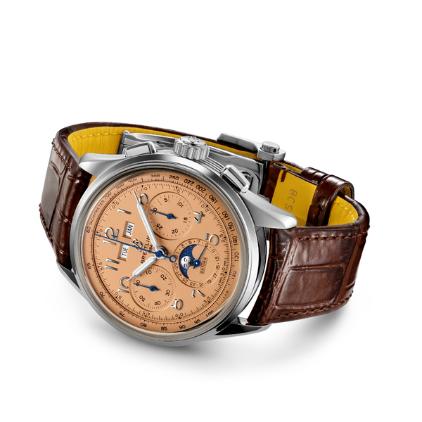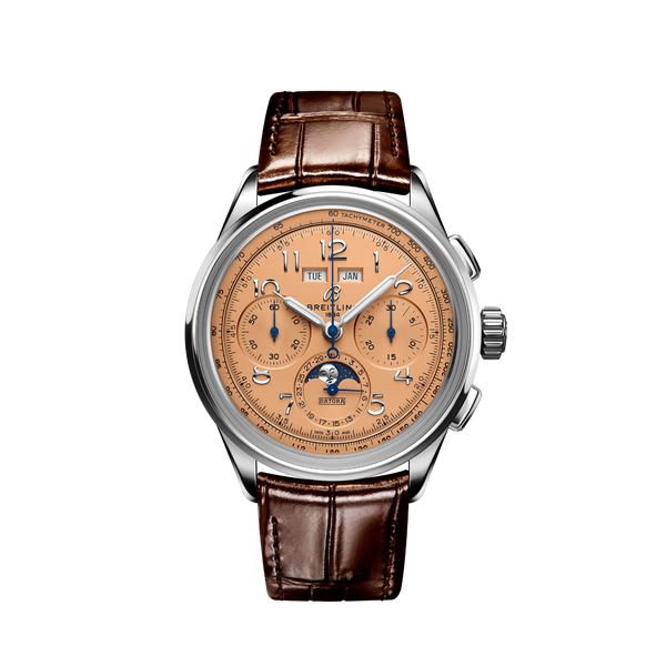 Die Premier Datora, eine Hommage an drei Generationen von Erfindern um Léon, Gaston und Willy Breitling, ist mit ihren komplexen Funktionen wie Tages-, Datums- und Mondphasenanzeige der raffinierteste unter den Breitling-Chronographen. Nach Willy Breitlings Auffassung gibt die Premier «unweigerlich Zeugnis von tadellosem Geschmack». Die neueste Premier Generation haucht diesen zeitlos eleganten Chronographen neues Leben ein und präsentiert Breitlings höchste Uhrmacherkunst, die sich in den ikonischen Premier-Komplikationen widerspiegelt: die Premier Chronograph, die Premier Duograph und die Premier Datora. Diese von Breitlings zeitlosen Klassikern inspirierte Premier Datora ist mit rechteckigen Chronographendrückern sowie arabischen Ziffern ausgestattet und besticht durch elegante Designideen wie Nuten an den Gehäuseseiten, transparentem Saphirboden und klassischen Zeigern. Die Premier Datora ist in zwei Varianten erhältlich: aus Edelstahl mit kupferfarbenem Zifferblatt und braunem Alligatorlederarmband oder aus 18-karätigem Rotgold mit silberfarbenem Zifferblatt und braunem Alligatorlederarmband. Der Begriff «Datora» wurde in den 1940er-Jahren von Breitling verwendet und beschreibt einen Chronographen mit umfassender Tages-, Datums-, Monats- sowie Mondphasenanzeige. Die Premier Datora wird mittels COSC-zertifiziertem Breitling-Manufakturkaliber B25 angetrieben.