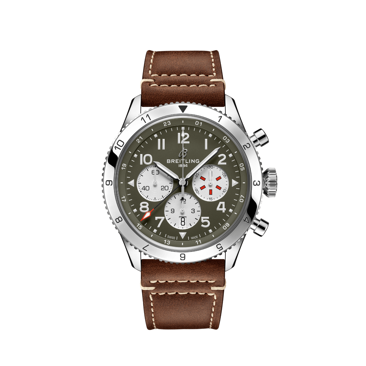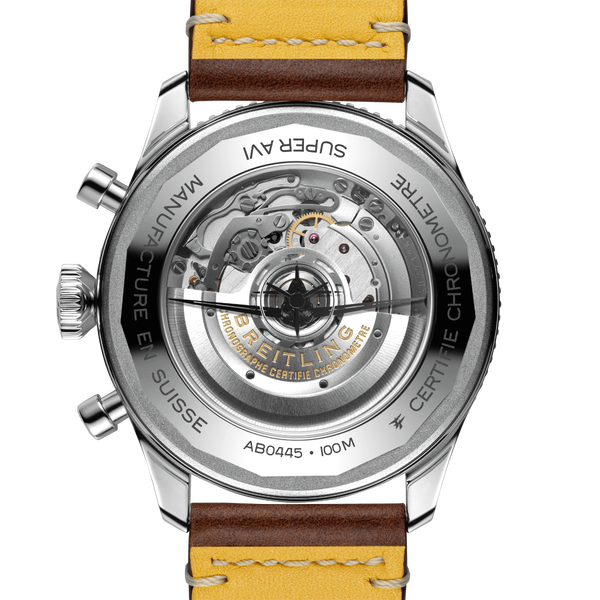 Von den ersten mutigen Starts bis zur Geburtsstunde des kommerziellen Flugverkehrs ist die Geschichte von Breitling untrennbar mit der Luftfahrt verbunden. In den 1930er-Jahren machte sich das Breitling Huit Aviation Department mit der Entwicklung von Präzisions-Cockpituhren einen Namen. Zwei Jahrzehnte später stellte es ein weiteres neuartiges Fluginstrument vor – nun allerdings in tragbarer Form: die Ref. 765 AVI. Diese wegweisende Fliegeruhr schuf den technischen Hintergrund für die heutige Super AVI, eine Kollektion, die von der Robustheit der berühmten frühen Flugzeuge inspiriert ist. Die Super AVI Curtiss P-40 Warhawk würdigt eine dieser Legenden. Die als Jagdflugzeug konzipierte Curtiss P-40 Warhawk hob erstmals im Jahr 1938 ab und erwies sich schnell als ausgesprochen agiles Luftgefährt. Nicht nur konnte sie atemberaubend enge Kurven fliegen, was ihr im Gefecht oft einen Vorteil verschaffte. Dank ihrer robusten Bauweise war sie auch in rauem Wetter und sogar nach vielen Kollisionen noch flugfähig. Die Haifischmaullackierung am Bug, eine klare Herausforderung an den Gegner, zementierte den Ruf der Warhawk als Rebellin der Lüfte. Als echte Pilotenuhr, die dafür konzipiert wurde, den Herausforderungen eines Vintage-Cockpits standzuhalten, verfügt die Super AVI Curtiss P-40 Warhawk über grosse, hervorragend ablesbare arabische Ziffern auf dem Zifferblatt und der Lünette. Das robuste Gehäuse hat einen Durchmesser von 46 mm, die überdimensionierte Krone befindet sich an der 3-Uhr-Position. Die geriffelte Lünette sorgt für optimale Griffigkeit, während das Kalbslederarmband mit Ziernaht optisch an die klassischen Fliegerjacken erinnert. Piloten und andere Reisende werden die Möglichkeit schätzen, über die 24-Stunden-Markierung auf der Innenlünette und den GMT-Zeiger mit roter Spitze eine zweite Zeitzone anzuzeigen. Angetrieben wird die Super AVI von einem COSC-zertifizierten Breitling Manufakturkaliber B04, das eine Gangreserve von etwa 70 Stunden bietet.