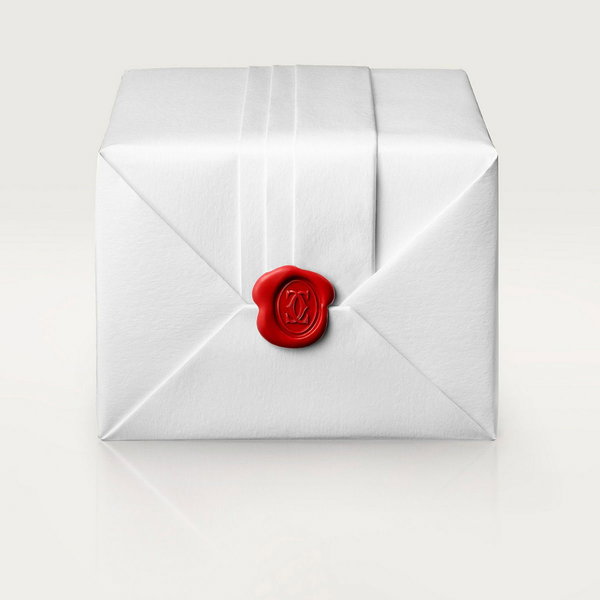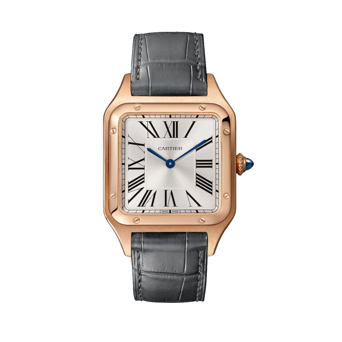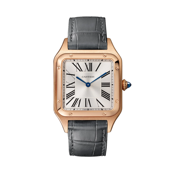 Santos-Dumont, großes Modell, Quarzwerk mit langer Laufzeit (~ 6 Jahre). Gehäuse aus 750er Roségold, perlierte Krone mit einem Saphircabochon besetzt, satiniertes silberfarbenes Zifferblatt mit Sonnenschliff, römische Ziffern, schwertförmige Zeiger aus gebläutem Stahl, Saphirglas, Armband aus grauem Alligatorleder, Stiftschließe aus 750er Roségold. Gehäuseabmessungen: 43,5 x 31,4 mm. Höhe: 7,3 mm. Wasserdicht bis zu 3 bar.