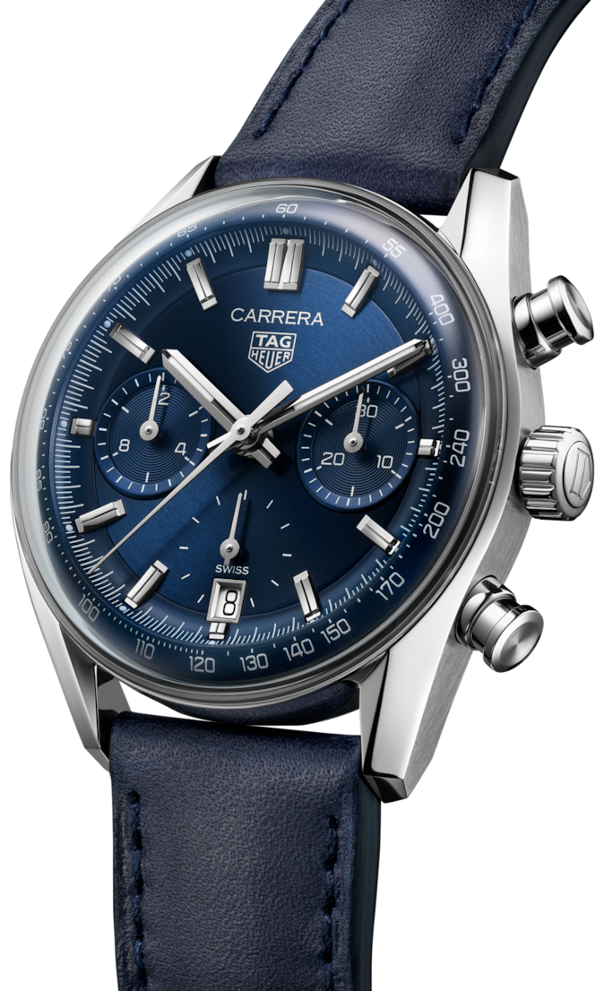 Diese Neuinterpretation der legendären Heuer Carrera setzt mit ihrem markanten blauen TAG Heuer Carrera Look ein Zeichen klassischer Eleganz. Diese Uhr, die das Beste der ikonischen Carrera mit kühnen technischen Ergänzungen hervorhebt, zeigt stolz ihr aufregendes Design.