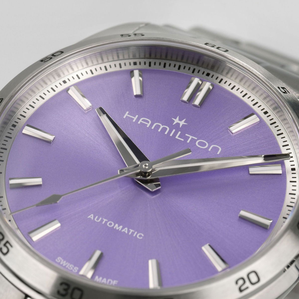 Die Jazzmaster Performer-Serie überzeugt durch ihre ausdrucksstarke sportlich-elegante Optik und ist wie geschaffen für alle, die weder auf Funktion noch auf Stil verzichten möchten. Diese Jazzmaster Performer Automatic wird vom Automatikwerk H-10 mit 80 Stunden Gangreserve angetrieben. Sie besitzt ein 34-mm-Edelstahlgehäuse, das durch ein lavendelfarbenes Zifferblatt in kühler Optik, vernickelte Indizes und ein elegantes Edelstahlarmband abgerundet wird.