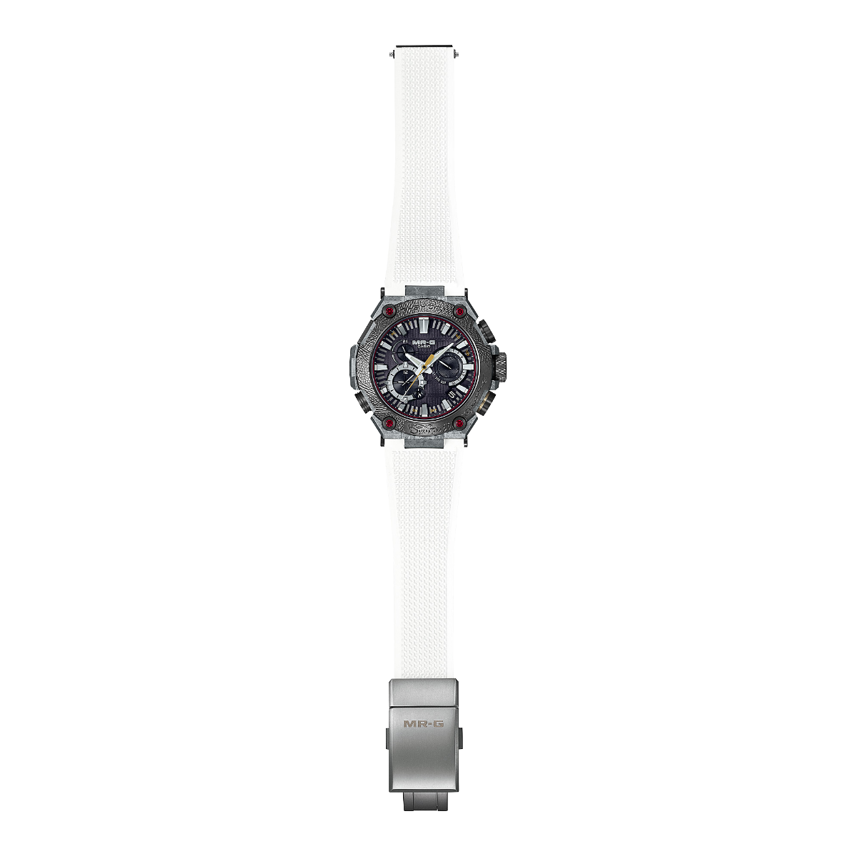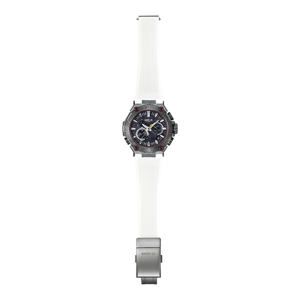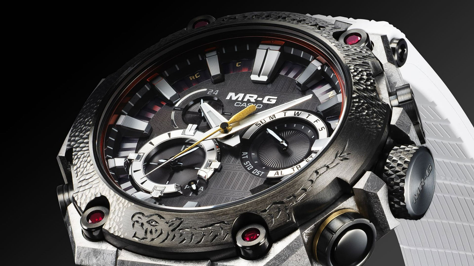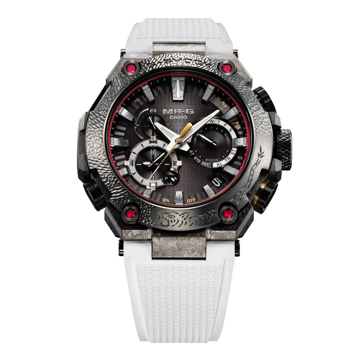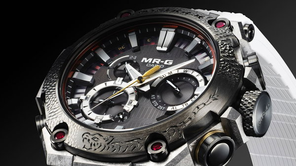 Feiere mit uns 40 Jahre G-SHOCK mit Luxus und Stil und einer neuen limitierten Edition der der High-End-Serie MR-G von G-SHOCK zur Ehrung japanischer Handwerkskunst. Dieser Zeitmesser ist traditionellen japanischen Handwerkstechniken gewidmet, die seit Jahrhunderten von Generationen weitergegeben werden, und zollt den stolzen Samurai-Kriegern und ihrer Ästhetik Tribut. Dieses Modell ist einem originalen „Shougeki-Maru: Gai“ nachempfunden, den Kabuto-Helm, den Casio für die MR-G-Serie in Auftrag gegeben hat. Die Lünette steht für das ""Maedate""-Wappen dieses ganz besonderen Helms mit Tigerdesign und besitzt ein vom Schmied KOBAYASHI Masao eingraviertes Steinrelief. Jede Uhr dieser auf 700 Stück limitierten Ausgabe ist ein einzigartiges, handgraviertes Meisterwerk. Das besonders langlebige und samtige Armband aus Fluorkautschuk Dura Soft in Reinweiß erinnert an den Look der weißen „Ito Odoshi“-Schnürung*1, die bei der Herstellung traditioneller japanischer Rüstungen verwendet wird. Ein tiefschichtiger Aushärtungsprozess und AIP® in dunklem Silber werden auf das rekristallisierte Titangehäuse aufgetragen. Damit entsteht die Farbe des „Shougeki-Maru: Gai“-Helms. Eine zur Feier des 40-jährigen Bestehens von G-SHOCK speziell gravierte Metallplatte auf der Gehäuseseite verleiht dem Design das gewisse Extra, ebenso wie die vier künstlichen Rubine*2 in der Lünette, die die 40 Jahre symbolisieren. Diese Uhr ist nicht nur eine Hommage an die Tradition, sondern ist technologisch außergewöhnlich modern und praktisch. Die Uhr ist mit Bluetooth® für Smartphone-Konnektivität ausgestattet und passt sich an Funkwellen-Zeitsignale an, um weltweit eine präzise Zeitanzeige zu gewährleisten. Über die Smartphone App CASIO WATCHES lassen sich Funktionen wie Timer, Alarm oder Weltzeit bequem über das Handy einstellen. Und auch das Ein- und Umstellen von Sommer- und Winterzeit übernimmt das Handy vollautomatisch. Immer und überall. Dieses besondere MR-G-Modell, das dem 40-Jahre-Jubiläum wahrhaft würdig ist, feiert sowohl die traditionelle Handwerkskunst als auch die modernen Technologien Japans, die in diesem von Samurais inspirierten Zeitmesser vereint sind. *1 Weiße „ito odoshi“: die weiße Schnürung, die die Platten von Shikoro-Rüstungen zusammenhält. Das Reinweiß symbolisiert die starke Entschlossenheit eines Kriegers, der seinen eigenen Überzeugungen treu bleibt und von anderen nicht beeinflusst wird (wie das Weiß, das frei von anderen Farben ist). *2 Die Schraubenköpfe, mit denen die Lünette befestigt ist, sind mit künstlichen Rubinen von Kyocera versehen, die aus ethischen Gründen ausgewählt wurden. Seit der Antike ist der Rubin als „Stein der Sieger“ bekannt, und die Menschen glaubten, dass er zum Sieg führen würde.