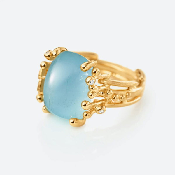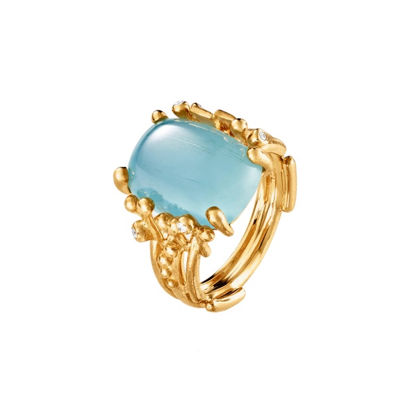 Der von Charlotte Lynggaard entworfene BoHo ring medium ist aus 750/- Gelbgold handgearbeitet, verziert mit einem 8,3 carat, 15x11mm blauen Aquamarin und fünf Diamanten 0,04 carat TW. VS. Die gehämmerten und polierten Goldoberflächen werden von Goldschmiedemeistern von Hand veredelt. Teil der BoHo Collection.