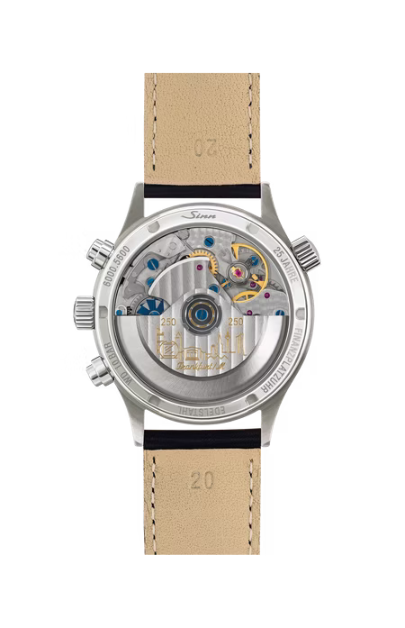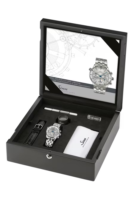 Die auf 250 Stück limitierte Sonderedition 6000 Jubiläum III verkörpert zeitlose Eleganz, technische Raffinesse und eine besondere Verbindung zur Stadt Frankfurt, in dem das Unternehmen seinen Hauptsitz hat. Schon der Blick durch das Deckglas aus Saphirkristall zeigt die edlen Attribute dieser Sonderedition auf: Es gibt die Sicht frei auf das galvanisch versilberte und mit Sonnenschliff veredelte Zifferblatt – eine Ausführung, die bei dieser Modellreihe erstmals umgesetzt wurde. Die Einrahmungen der Stunden- und Minutenzeiger sowie der von Hand aufgesetzten Appliken in glänzendem Blau – auch dies eine Premiere bei den Frankfurter Finanzplatzuhren – verleihen der Gesamtschau des Zifferblattes eine eindrucksvolle und frische Optik. Ein Blick auf das fein veredelte Uhrwerk durch den Sichtboden aus Saphirkristallglas zeigt die kunstvolle Mechanik des Schaltradchronographen – eine handwerklich anspruchsvolle Komplikation, dessen Tradition bis in die Mitte des 19. Jahrhunderts zurückreicht- sowie die Rotorgravur der Frankfurter Skyline mit individueller Limitierungsnummer. Die Anzeige der drei Zeitzonen auf 12-Stunden-Basis ermöglicht es, stets den Überblick zu behalten in einer globalisierten und vernetzten Weltwirtschaft. Bei aller Ästhetik erweist sich die Uhr zudem als sehr robust: Sie ist wasserdicht, druckfest bis 10 bar und unterdrucksicher.