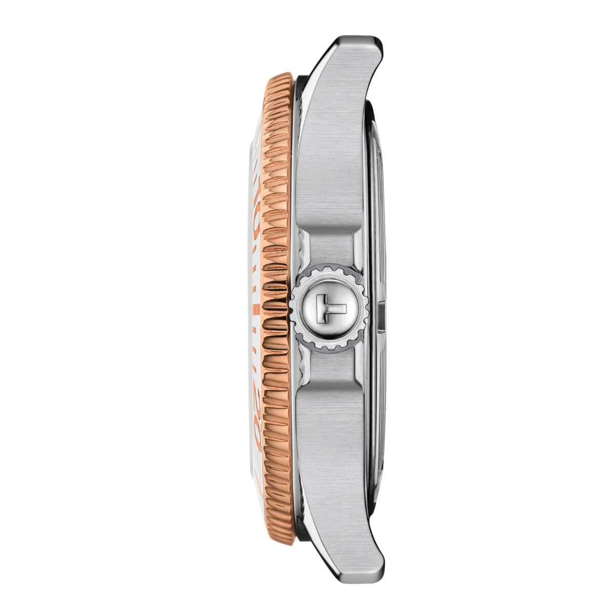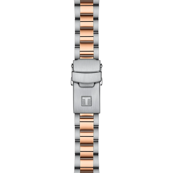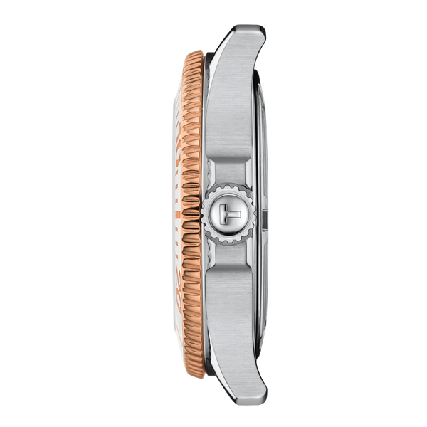 Dieses Tissot Seastar 1000 36mm Modell besitzt eine einseitig drehbare Bicolor-Lünette, weiß und am Rand umlaufend mit roségoldfarbener PVD-Beschichtung versehen. Ebenfalls roségoldfarben präsentieren sich die auf der Lünette abgetragenen Ziffern und Markierungen. Auf dem weißen Perlmuttzifferblatt mit Datumsanzeige sitzen roségoldfarbene Zeiger und Indizes mit großzügiger, weißer Super-LumiNova® Leuchtmasse-Beschichtung, die im Dunkeln grünlich leuchtet. Das 316L-Edelstahlarmband, mit roségoldfarbener PVD-Beschichtung auch in Bicolor gehalten, ist mit einem Schnellwechselsystem sowie mit einer Faltschließe mit Sicherung und Drückern ausgestattet.
