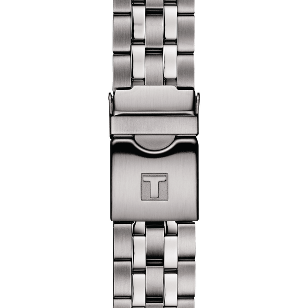 Dieses Modell hat ein massives 316L-Edelstahlarmband mit Sicherheitsfaltschließe und Taucherverlängerung sowie ein schwarzes Zifferblatt mit Indizes.