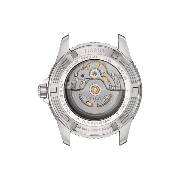 Dieses Tissot Seastar 1000 Powermatic 80 40mm Modell besitzt einen schwarzen Mineralglas-Lünettenring und ein Zifferblatt mit türkisblauem Farbverlauf. Sein Mineralglas-Sichtboden gibt den Blick auf das Powermatic 80 Uhrwerk frei. Das ebenso massive wie flexible 316L-Edelstahlarmband mit Schnellwechselsystem und Sicherheitsfaltschließe mit Drückern hält die Uhr elegant und sicher am Handgelenk.
