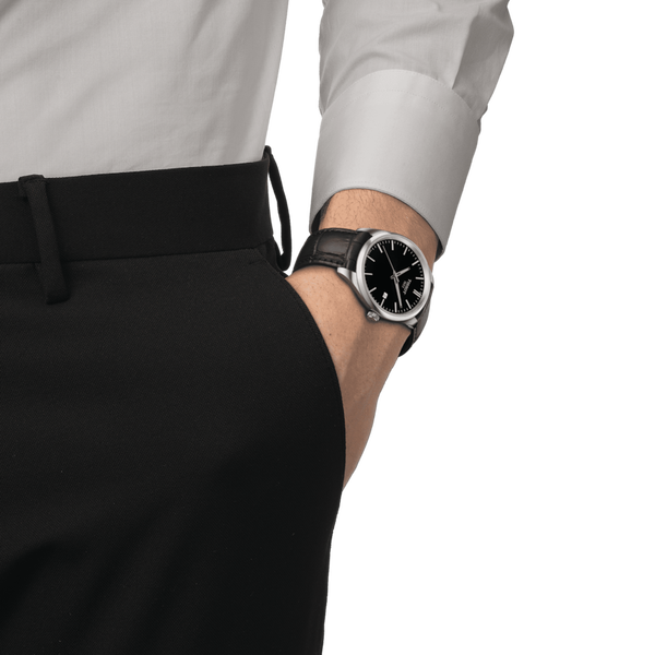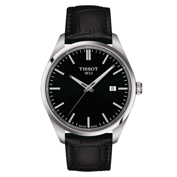 Dieses Tissot PR 100 Quartz 40mm Modell verfügt über ein 40 Millimeter messendes 316L-Edelstahlgehäuse und ein schwarzes Zifferblatt mit Stabindizes und Datumsanzeige. Letzteres liegt gut geschützt unter kratzfestem Saphirglas. Das weiche, flexible Lederarmband in Schwarz erlaubt dank Schnellwechselsystem einen einfachen, werkzeuglosen Austausch. Es besitzt eine Dornschließe.