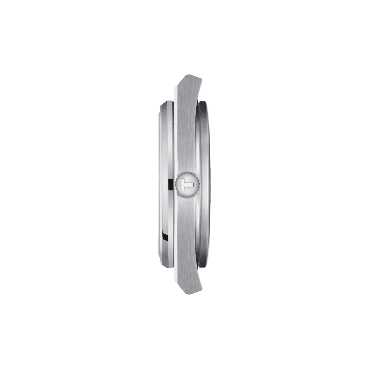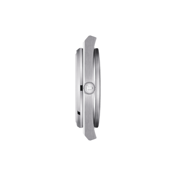Das 316L-Edelstahlgehäuse der Tissot PRX hat einen Durchmesser von 40 mm. Es weist eine leichte Tonneau-Form auf und wird von einer schmalen, runden Lünette geziert. An den Seiten wechseln sich vertikal gebürstete, abgerundete Finishes mit polierten Facetten ab.