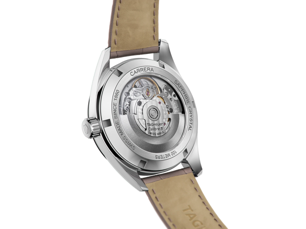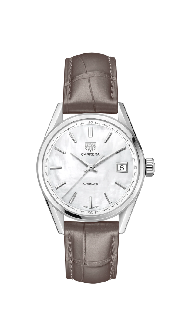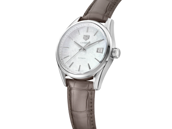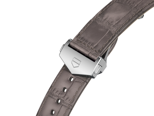 Das elegante Armband dieser TAG Heuer Carrera Lady besteht aus grauem Alligatorleder mit grauer Absteppung. Ein gewölbtes Saphirglas schützt das 36 mm Gehäuse. Beide Seiten sind entspiegelt, um in allen Situationen eine perfekte Ablesbarkeit zu gewährleisten. Diese in der Schweiz hergestellte Uhr ist mit einem außergewöhnlich präzisen Quarzwerk ausgestattet, das dieser Luxusuhr eine lange Lebensdauer garantiert.