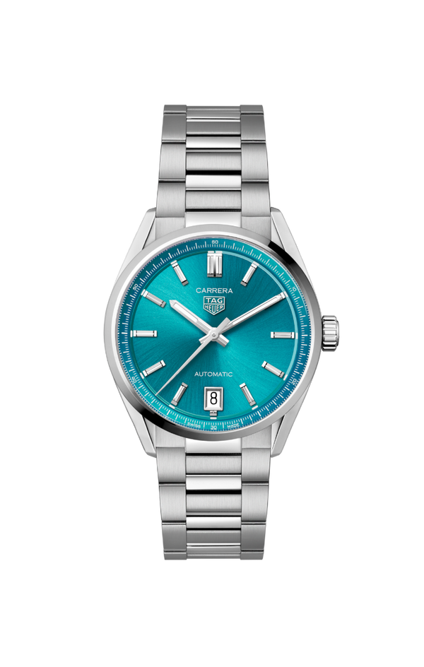 Die TAG Heuer Carrera Date in 36 mm ist ein spektakulärer Zeitmesser mit türkisblauem gebürstetem Zifferblatt mit Schneckenschliff und einem robusten Edelstahlgehäuse. Sie ist auf Eleganz und Präzision ausgelegt und bietet eine beeindruckende Mischung aus Stil und Funktionalität.